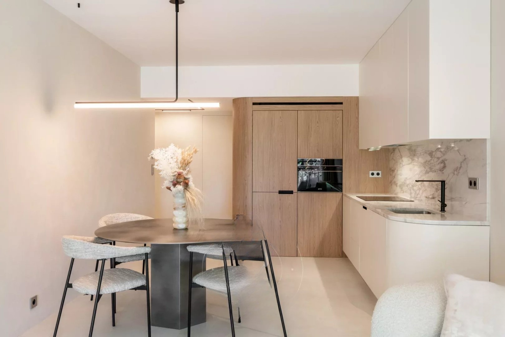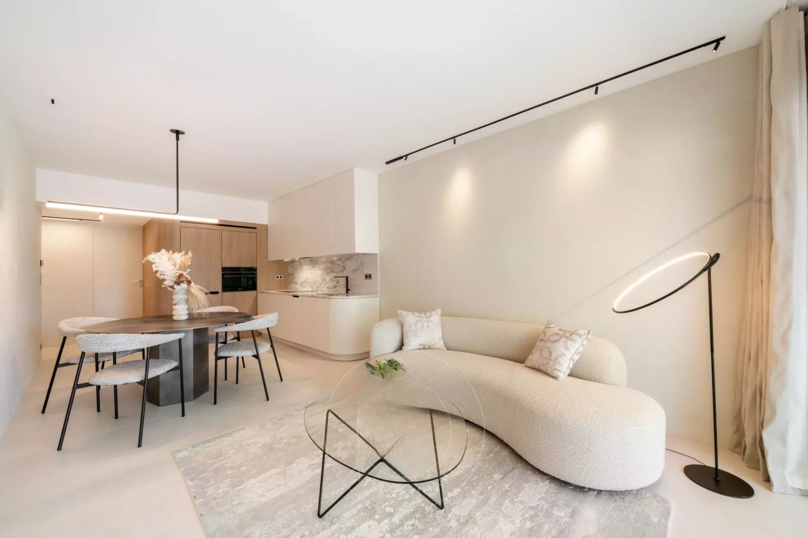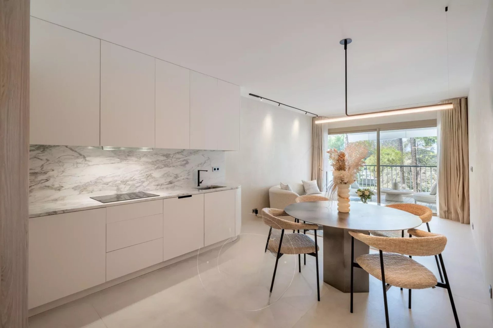 Квартира с высококачественным ремонтом обеспечивает светлое и современное жилое пространство. Просторная гостиная выходит на террасу с юго-западной экспозицией, кухня оснащена и открыта на гостиную. Две спальни, одна из них с ванной, а вторая с небольшим душем и общим доступом к балкону на северо-восточной стороне.