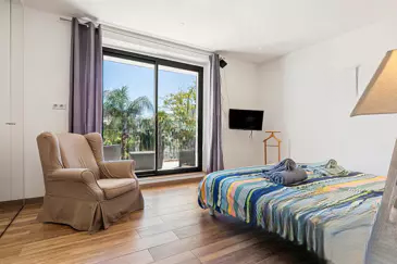 На первом этаже: вход, ведущий в светлую и просторную гостиную, ориентированную на юг с видом на сад и бассейн. Здесь расположена полностью оборудованная и обустроенная открытая кухня, подсобное помещение с небольшим наружным пространством, главная спальня с гардеробом и ванной комнатой с туалетом, а также гостевой туалет.