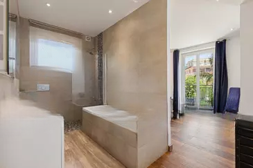 На втором этаже: холл, предоставляющий доступ к трем спальням, одна из которых с гардеробом и ванной комнатой, туалетом и собственная терраса с видом на море. Общая ванная комната с туалетом и терраса в 17 м², защищенная от взглядов.