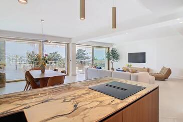 Из просторной гостиной, залитой светом, открывается красивая терраса площадью 22 м² с панорамным видом на море и пышный парк. Просторные комнаты, тщательно выполненные отделочные работы и спокойная, светлая обстановка создают атмосферу уюта и роскоши.