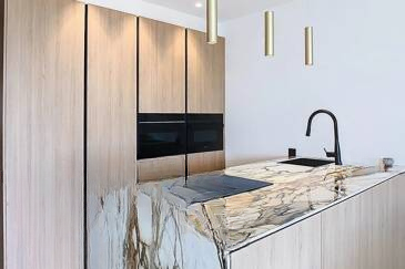 Кухня, полностью оборудованная и интегрированная в жилую зону, сочетает в себе функциональность и эстетику для элегантной повседневной жизни.