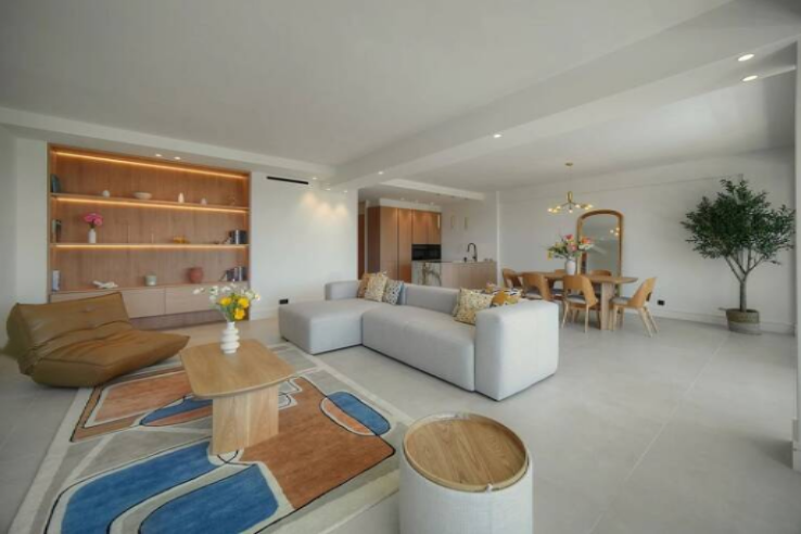 Очень красивая квартира площадью 122,50 м² (109,50 м² по закону Каррез) с глубокой террасой в 23 м² с южной экспозицией и видом на море и острова Лерин. Просторная гостиная-столовая с оборудованной кухней, 2 спальни с ванными, душем и гардеробной, 3 туалета. Престижная и тихая резиденция с охранником и бассейном.