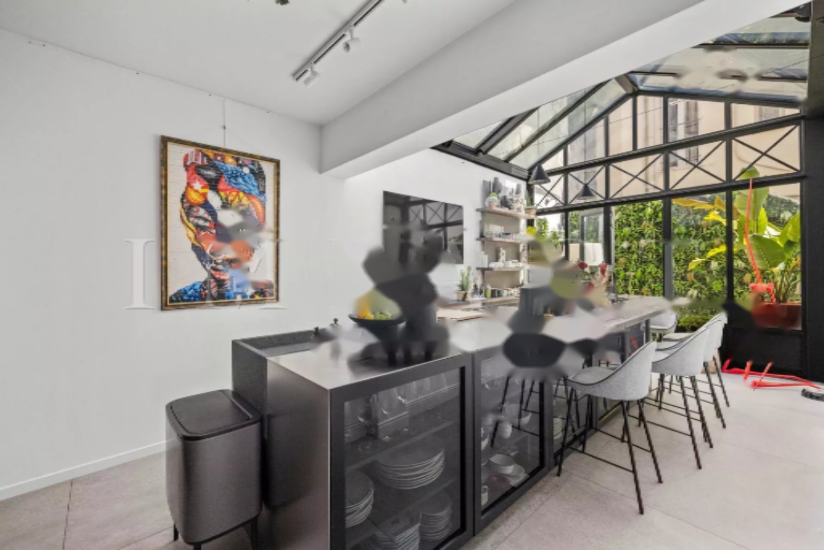 На уровне сада находится просторный холл, совмещенный с рабочим кабинетом, ведущий к двойной гостиной с камином, с выходом на красивую террасу и бассейн (5x2). Полупрофессиональная кухня высшего качества с световым колодцем.