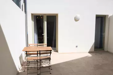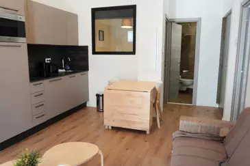 Квартира включает гостиную с оборудованной кухней, выходящую на наружное пространство площадью 19 кв. м, которое можно обустроить по своему усмотрению. Спальня с дверью на улицу, а также второе спальное место, открытое для гостиной, дополняют пространство. Ванная комната с душем и туалетом.
