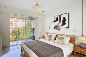 В одном из самых популярных районов Канн, в сердце района Palm Beach, всего в 300 метрах от знаменитого Бульвара де ла Круазет и пляжей, расположена эта великолепная проходная квартира площадью 75 кв. м, находящаяся в охраняемой и прекрасно ухоженной резиденции.