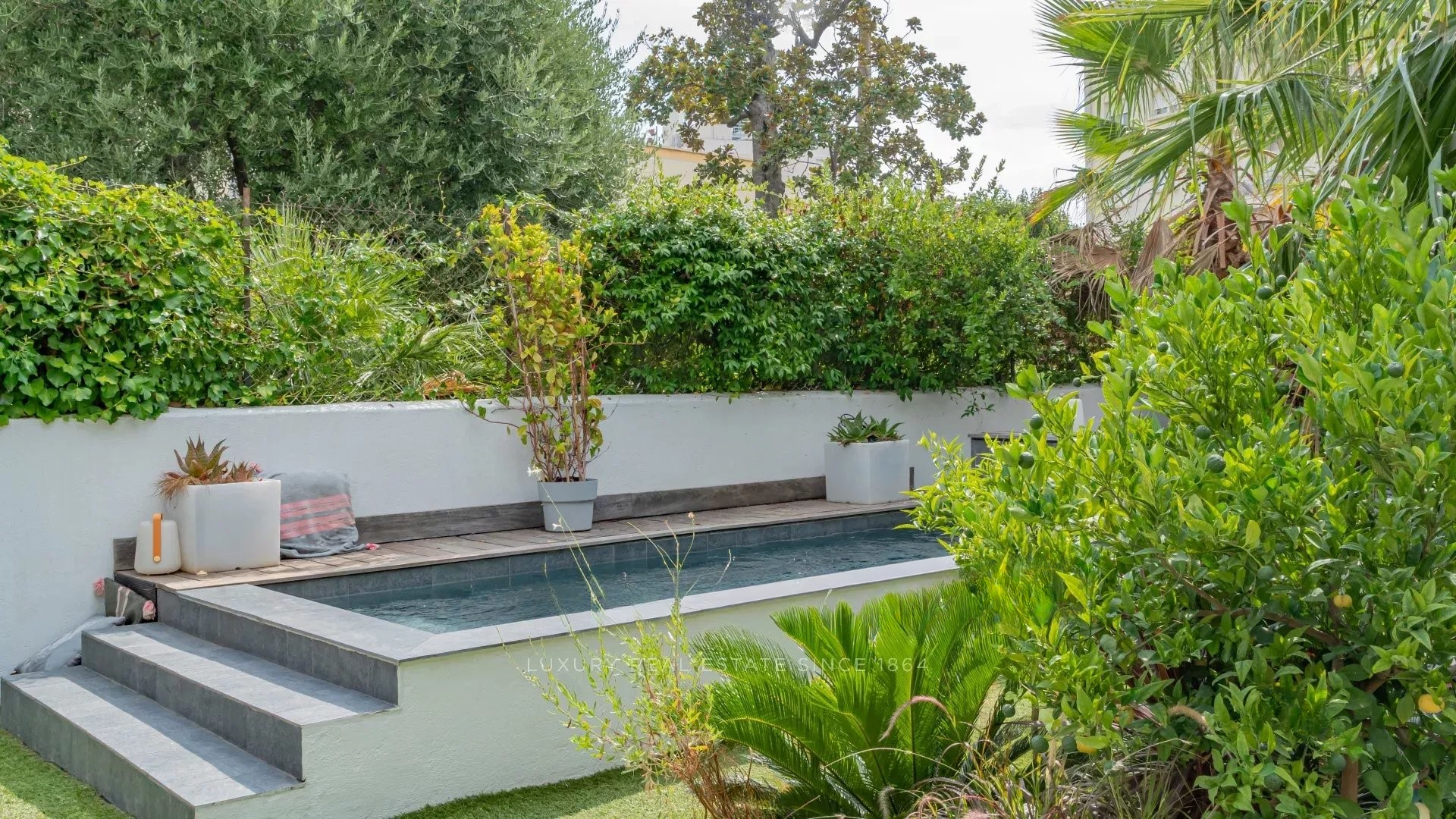 Очаровательный сад площадью 273 м² с плавательным бассейном (глубина 1,20 м) завершает этот объект.