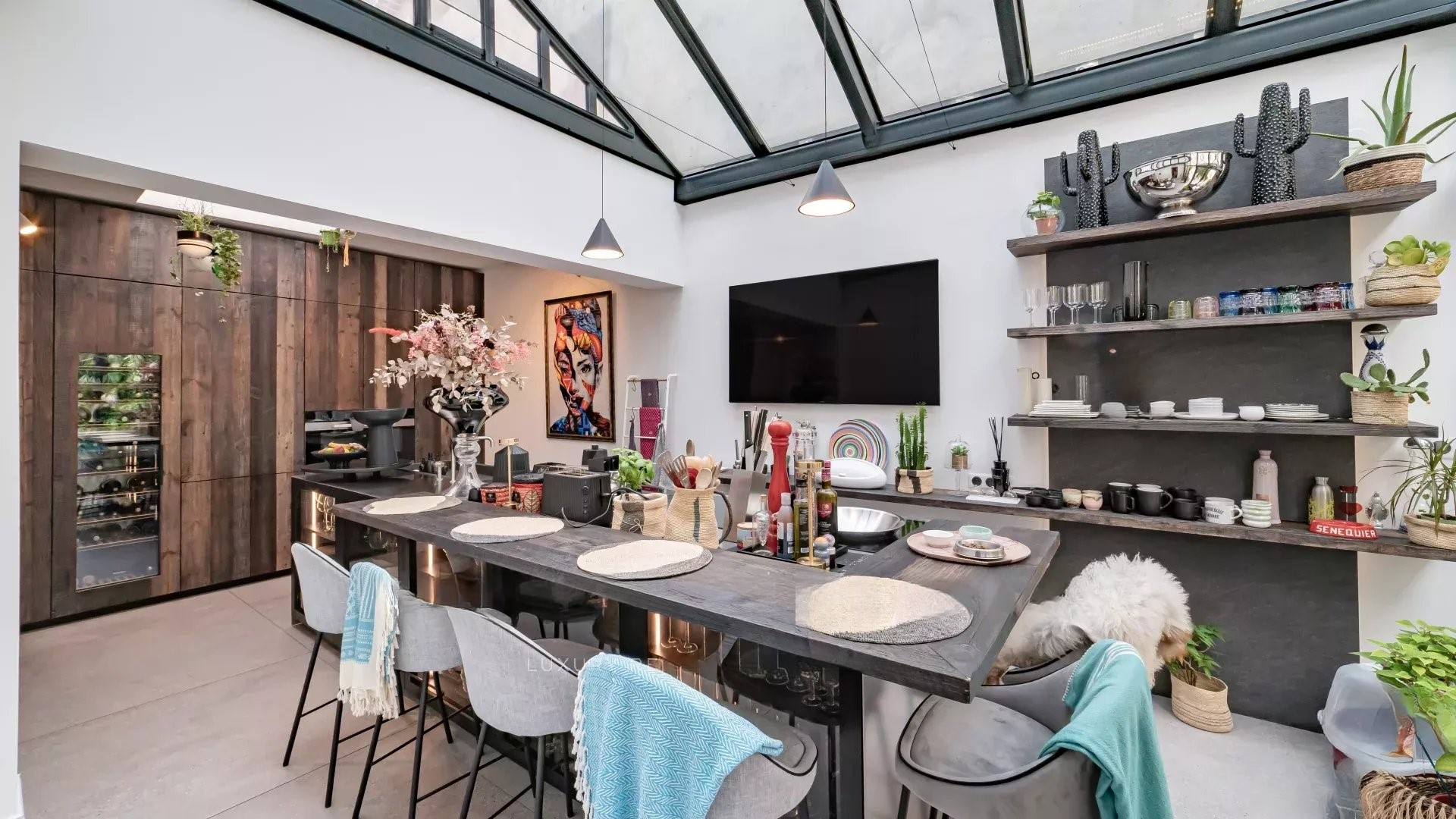 Площадь 170 м², просторная гостиная с обеденной зоной, залитой светом и открытой на улицу (высота потолка 3,10 м), большая полностью оборудованная кухня и гостевой туалет.