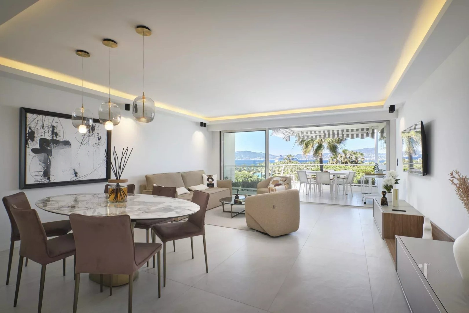 Эта квартира находится на 6-м этаже (предпоследнем) престижной резиденции на набережной Круазет. Она выполнена в высоком качестве и предлагает удивительный вид на море.