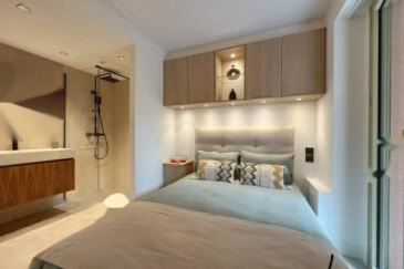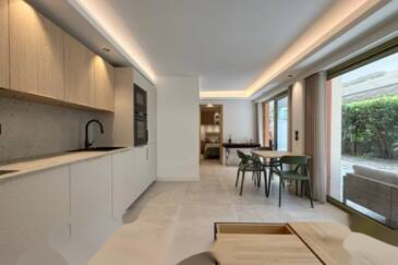Это двухкомнатная квартира на первом этаже, полностью отремонтированная и включающая прихожую, гостиную с оборудованной открытой кухней, спальню с душевой, гостевой туалет и террасу с садом площадью 57 м², предлагающую дополнительное пространство для жизни.