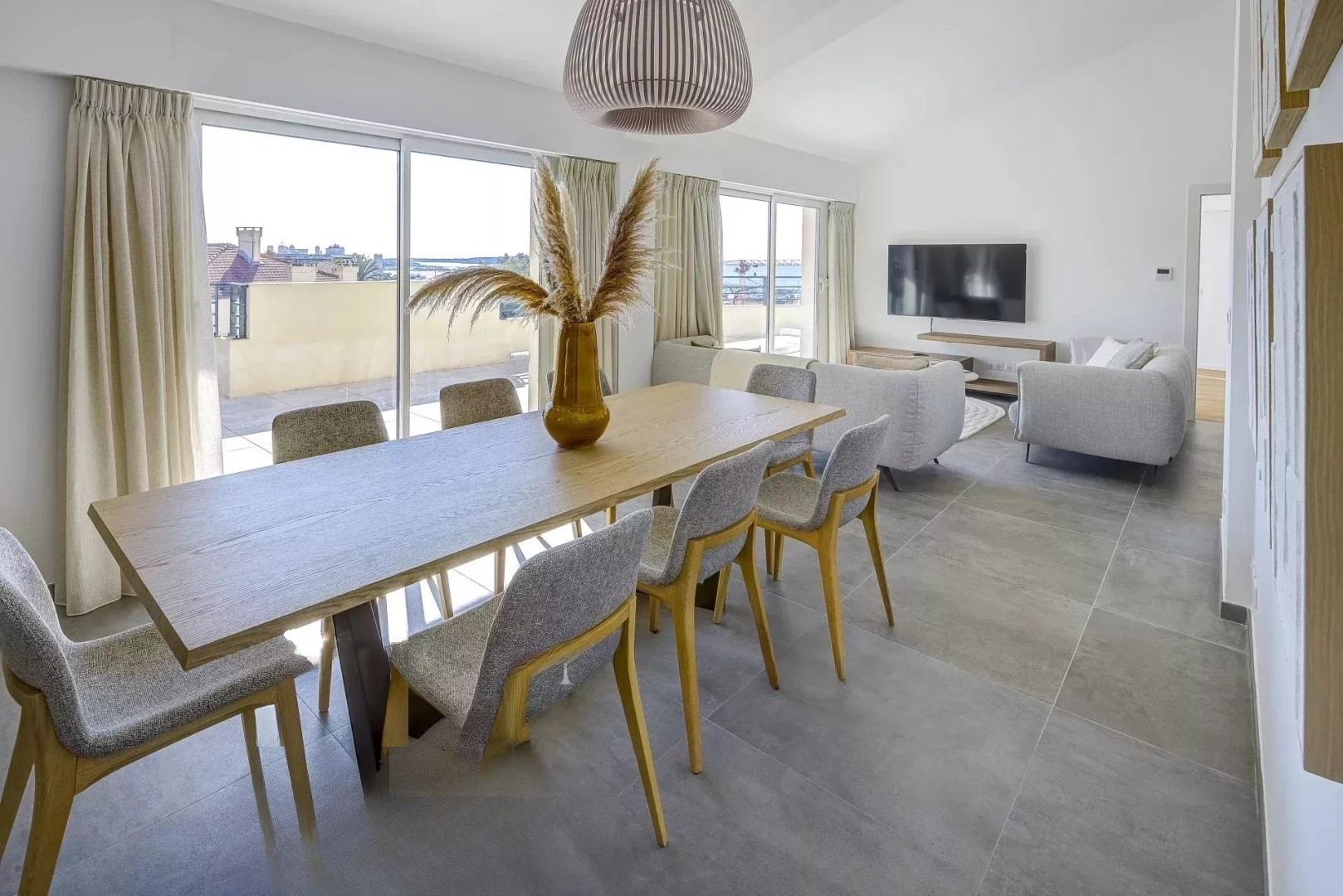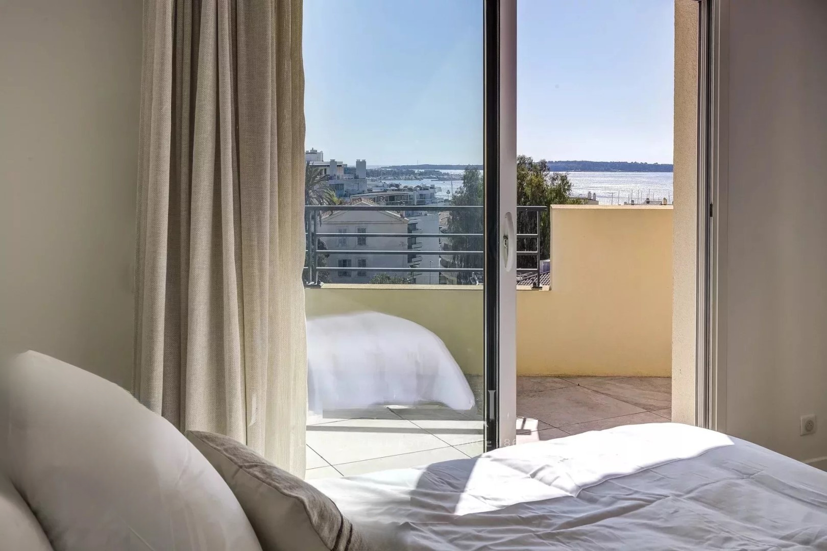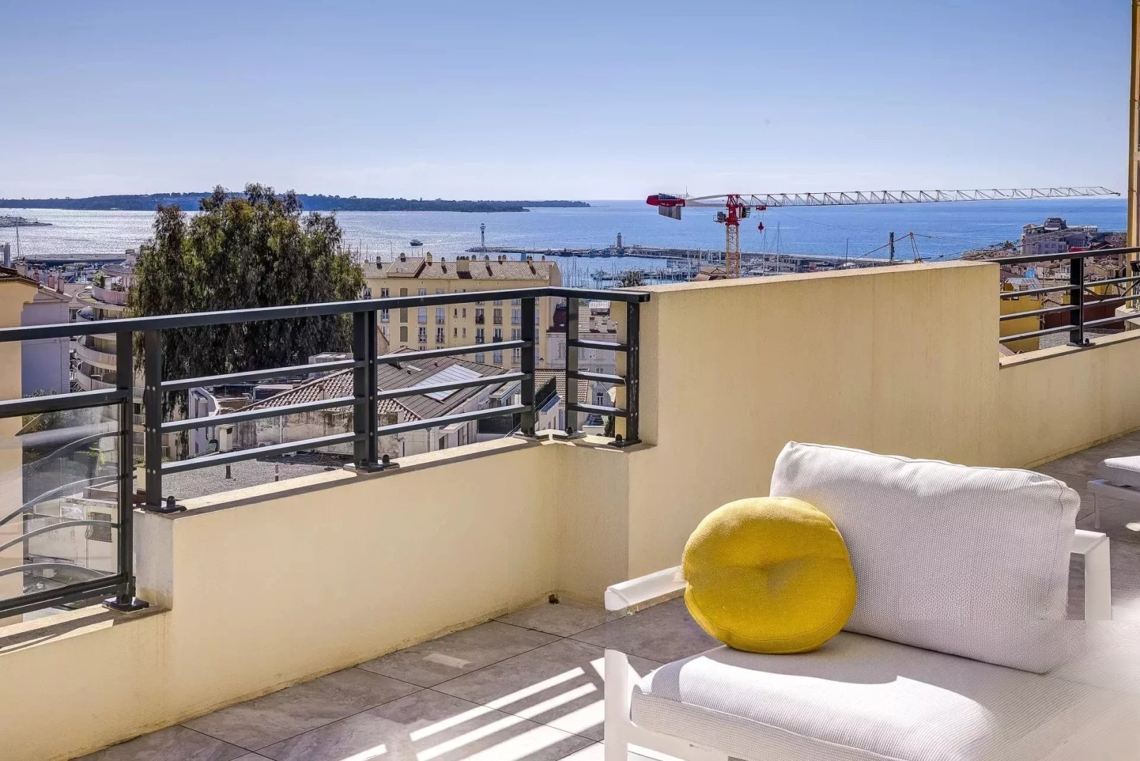 Этот пентхаус площадью 172 м², расположенный на крыше, открывается на впечатляющую террасу площадью 148 м² с панорамным видом на море, Леринские острова, старый порт и бухту Канн.