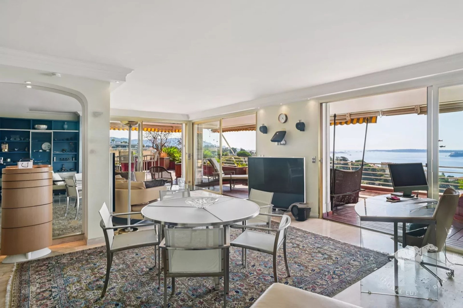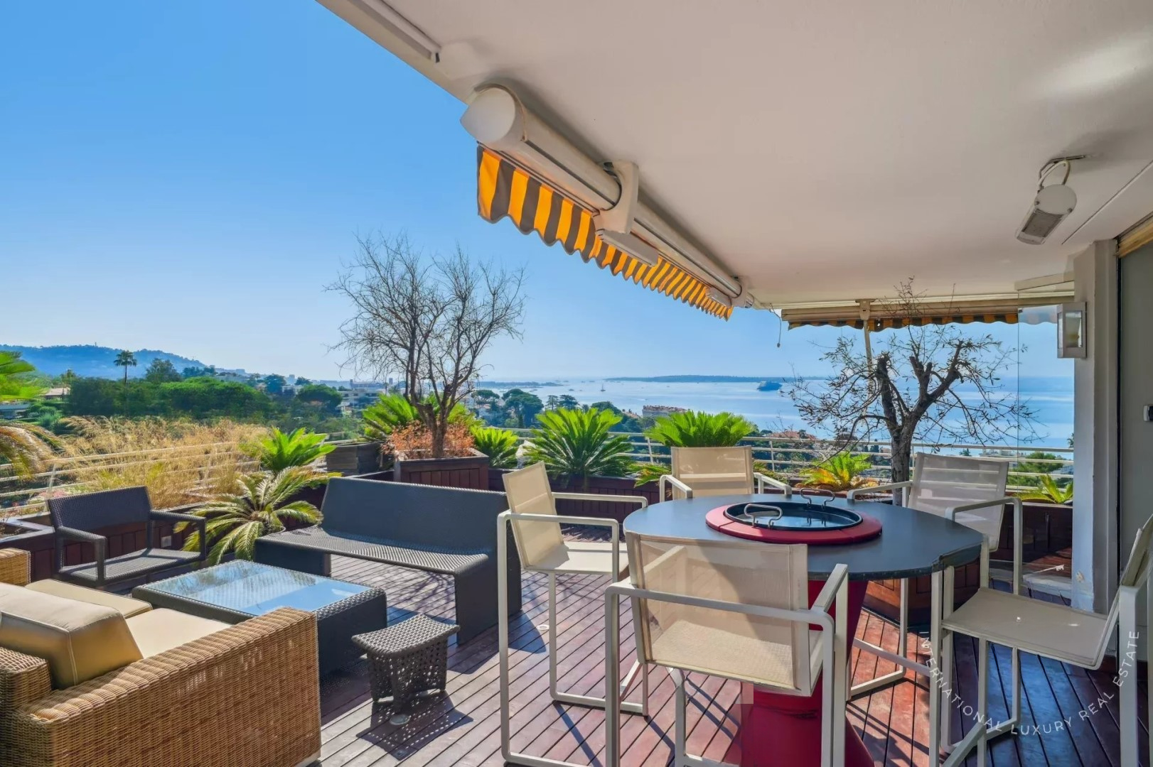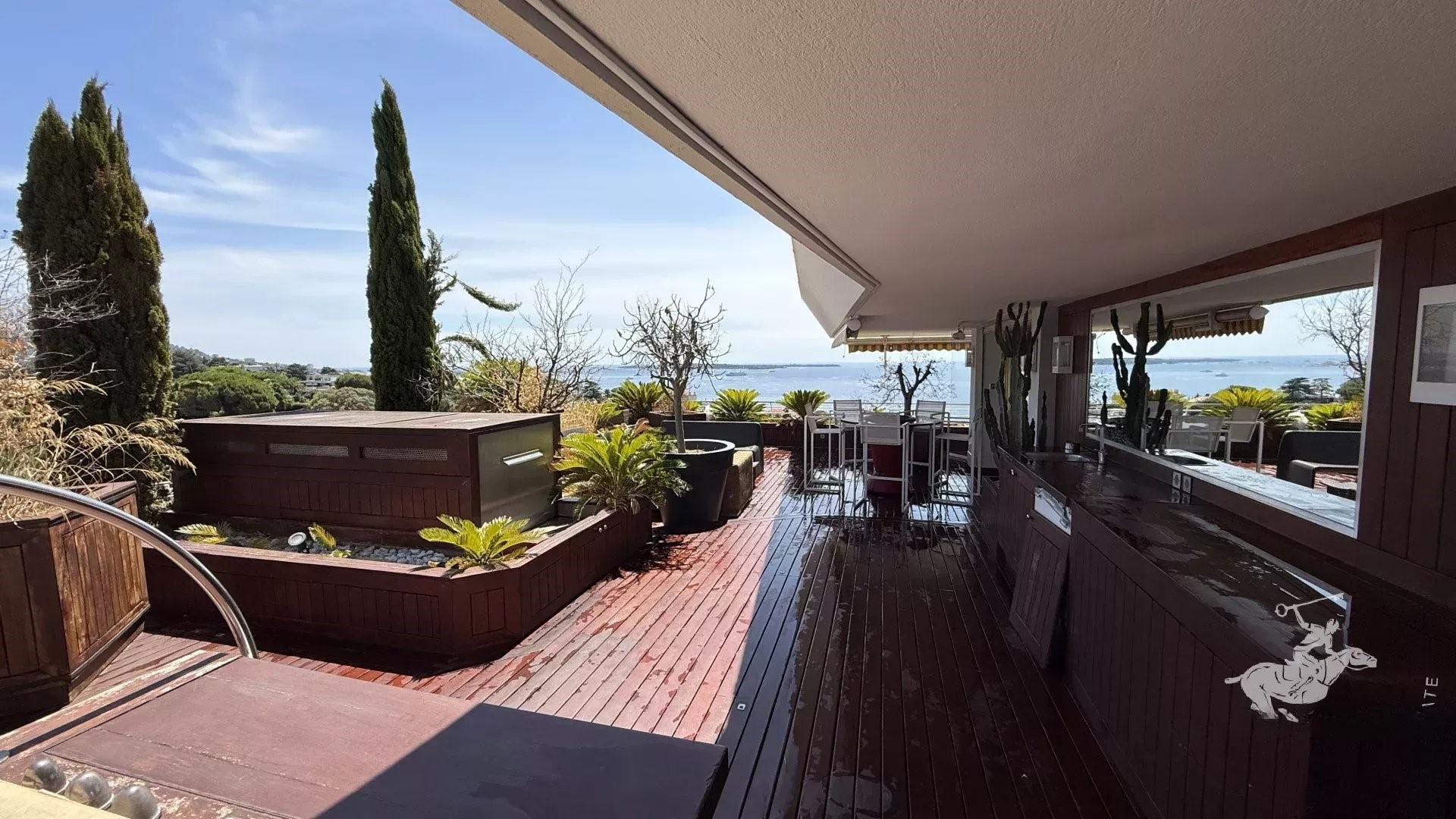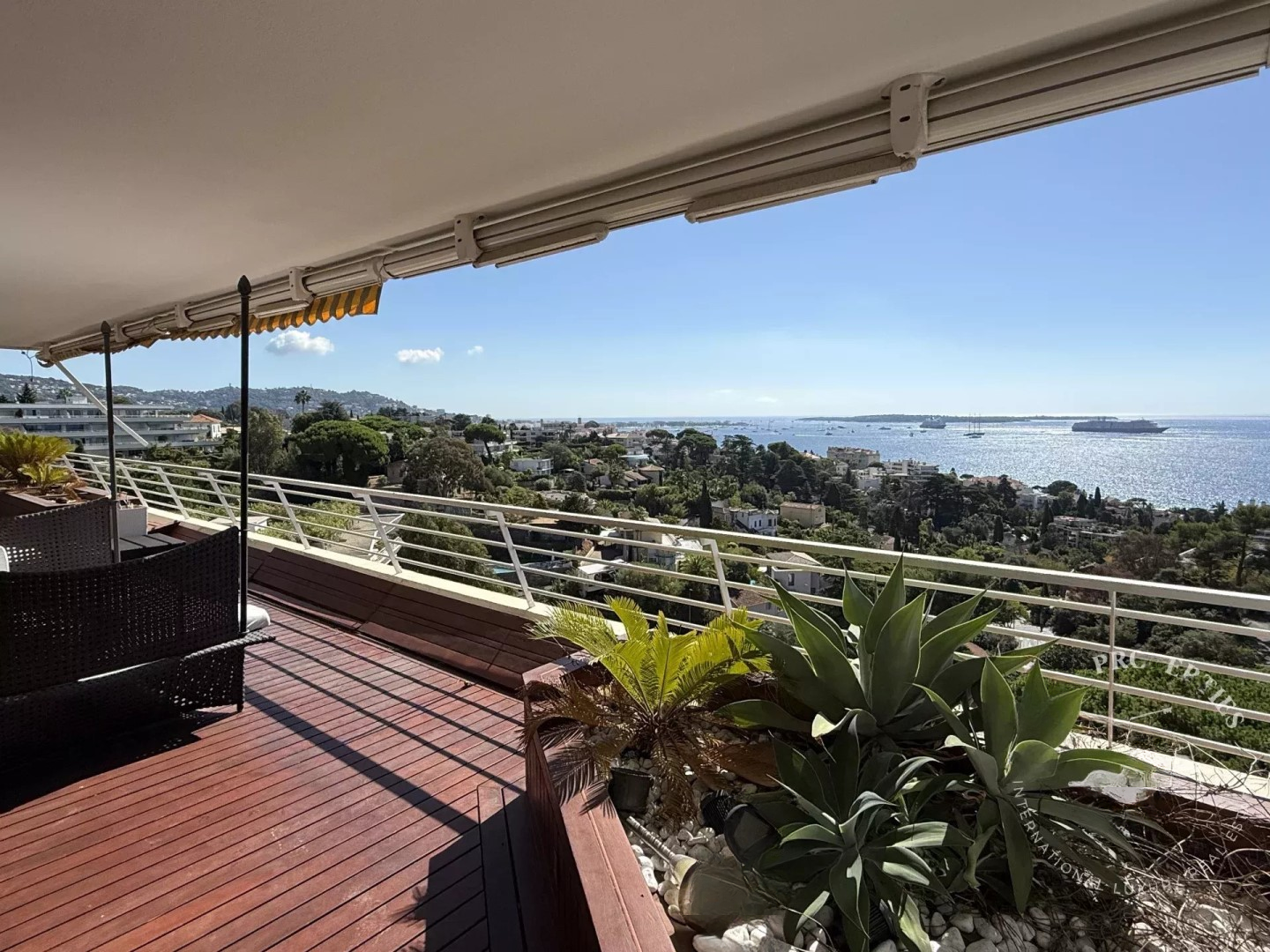 В настоящее время он оформлен как 3-комнатная квартира с возможностью трансформации в 4-комнатную по вашему желанию. Апартамент может похвастаться террасой около 140 м² с джакузи и одним из лучших видов на море в районе Croix des Gardes.