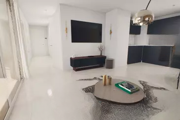 Прекрасную гостиную с открытой кухней размером 26 кв. м., выходящую на большой балкон площадью 18.6 кв. м.