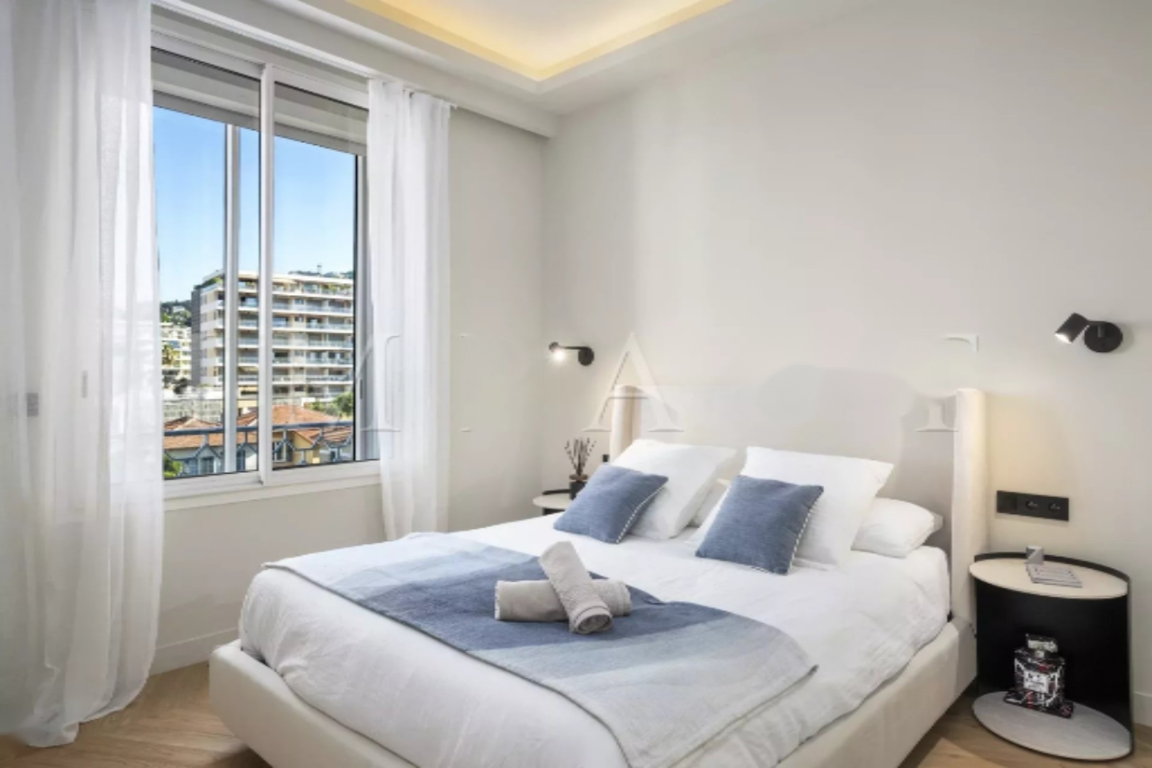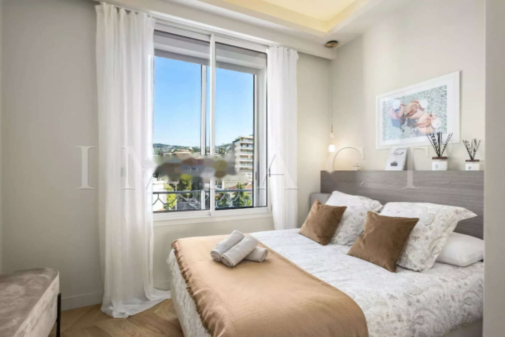 Великолепная квартира полностью отремонтирована и имеет площадь 100 м². Она расположена напротив порта Кэнто на знаменитом бульваре Круазетт, в престижной резиденции с охраной и консьержем.