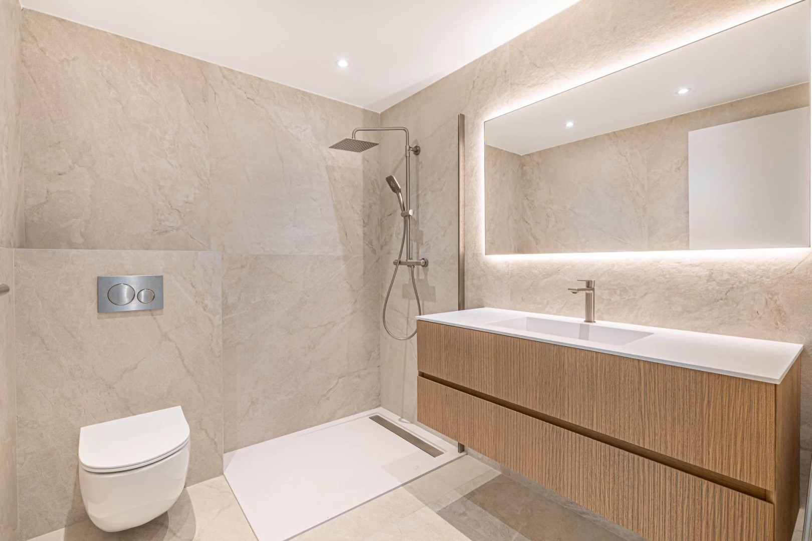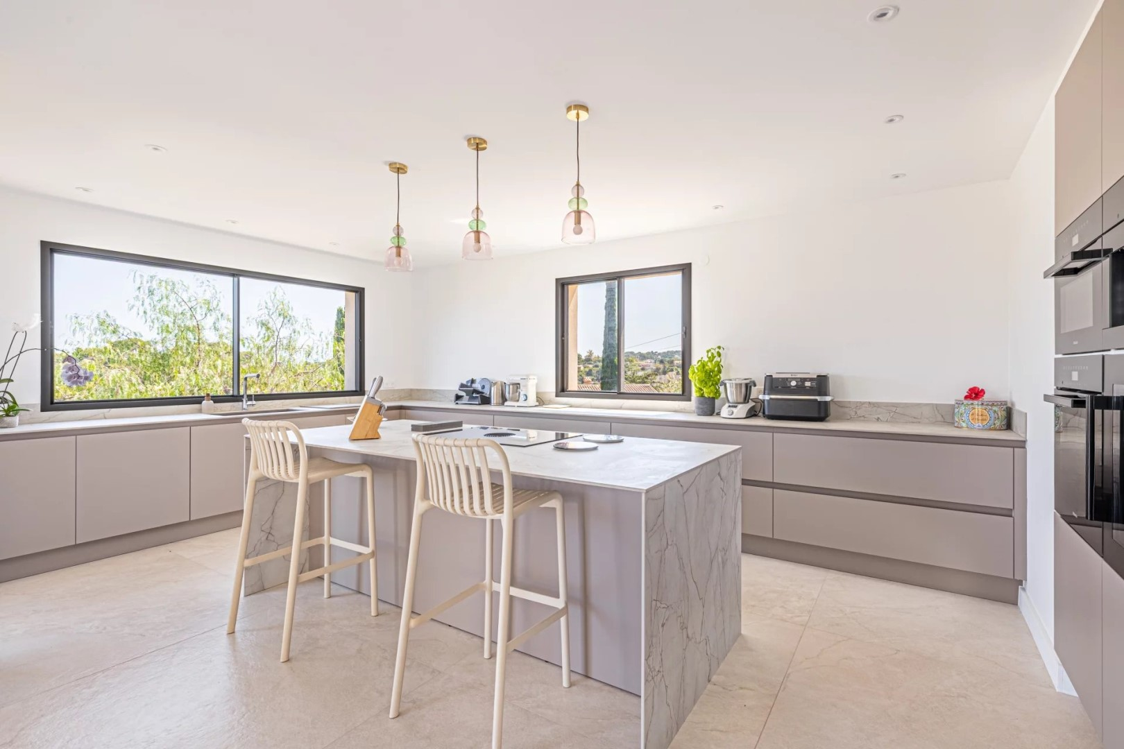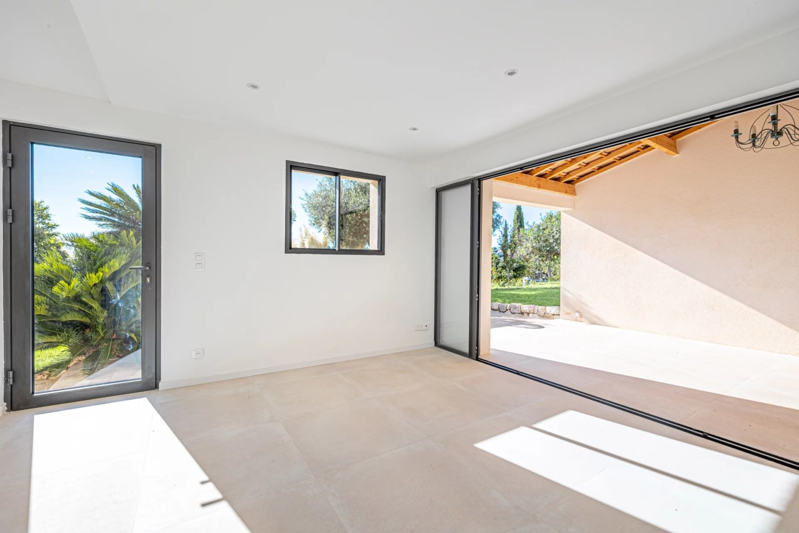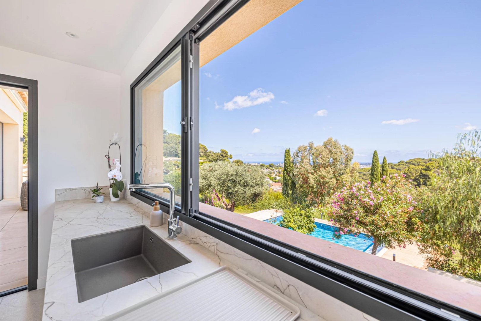 На нижнем уровне расположены три спальни с прилегающими ванных комнатами, каждая из которых открывается на ухоженный сад, а также две большие многофункциональные комнаты, которые можно использовать по своему усмотрению, будь то дополнительные места для хранения, просторный винный погреб или оздоровительное пространство, такое как сауна или хаммам, так как вода и дренаж уже установлены.