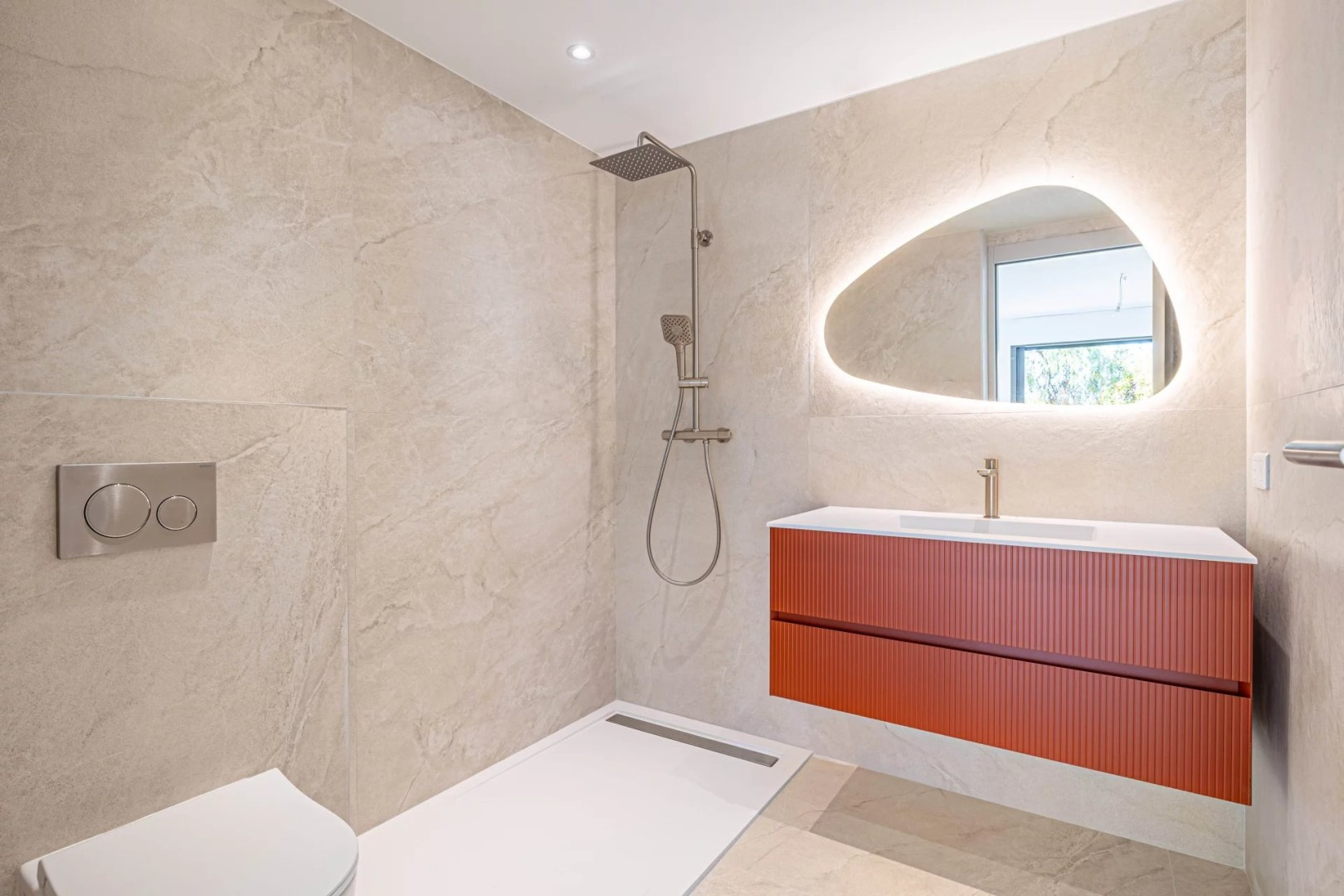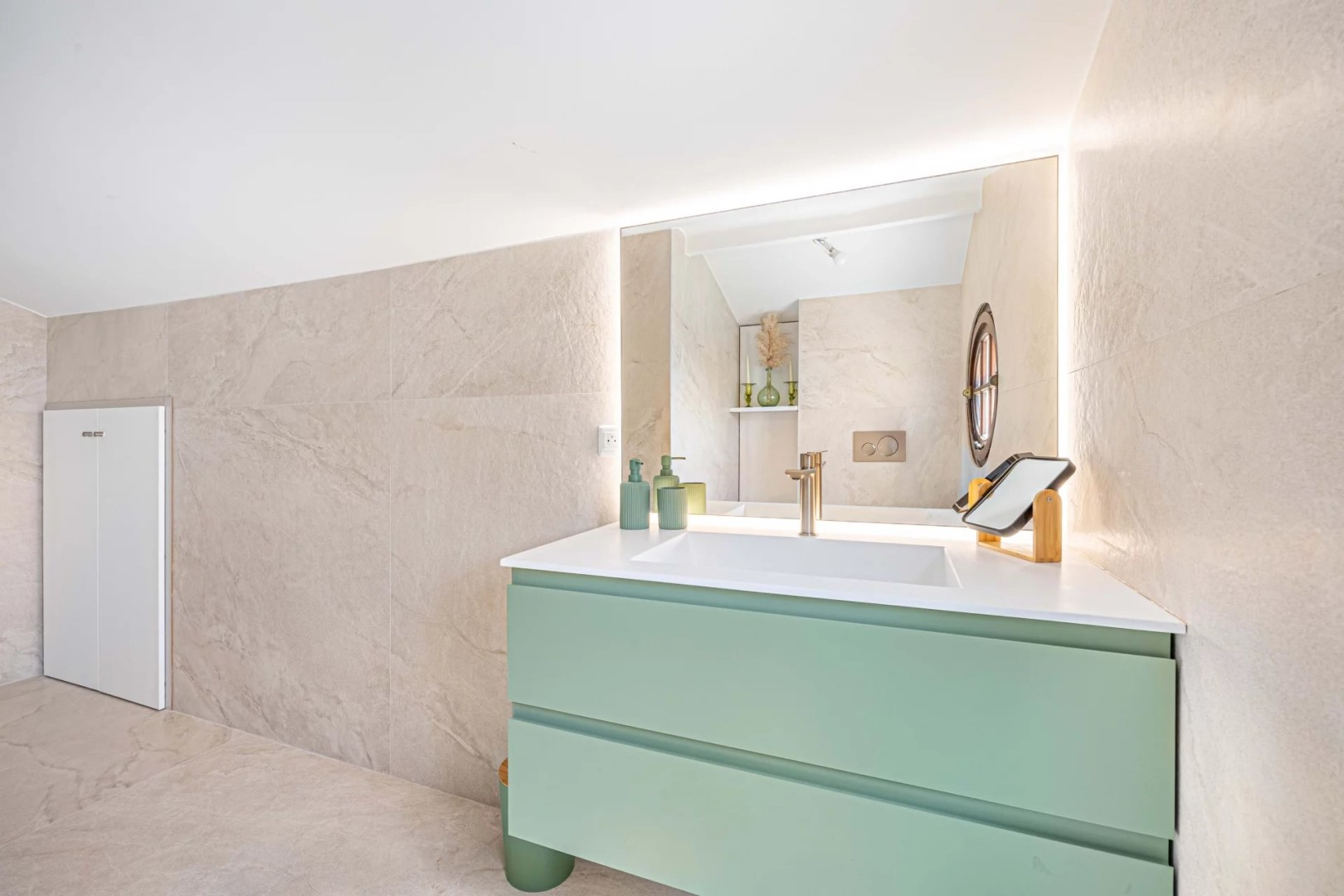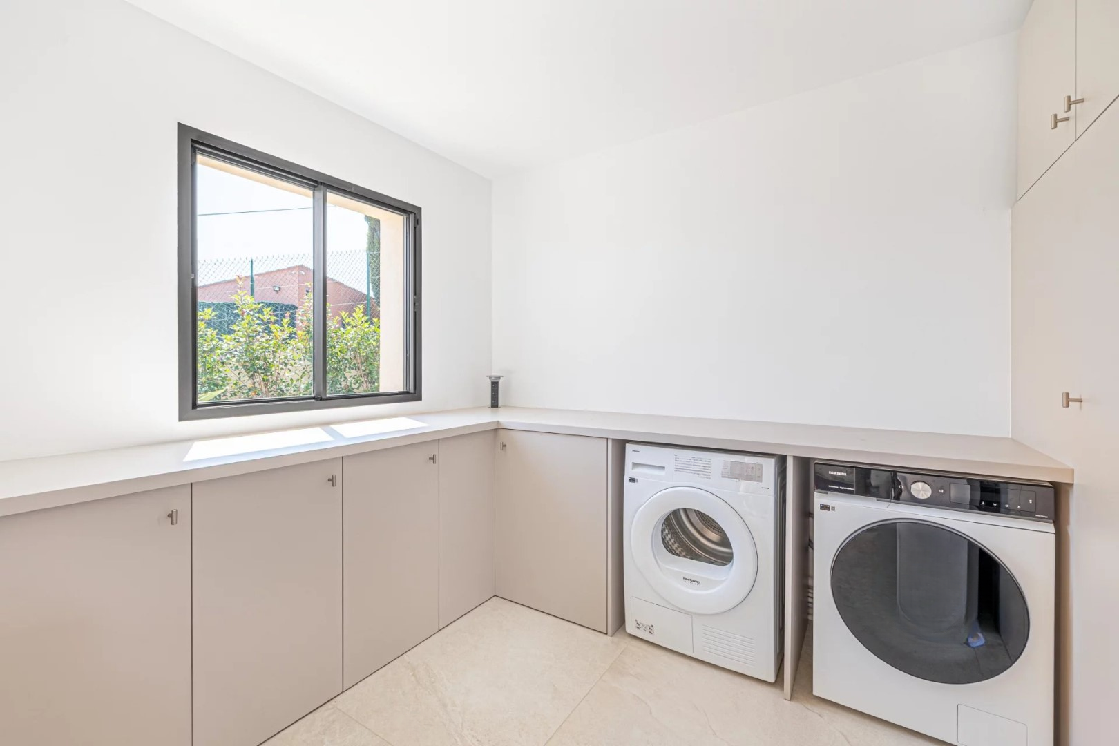 Цокольный этаж включает яркую просторную гостиную с выходом на террасу через большое застекленное окно с видом на море. Кухня площадью 21 м², мастер-спальня с гардеробной и ванной комнатой, продуманное прачечное пространство с множеством мест для хранения, а также гостевой туалет делают первый уровень особенно практичным.