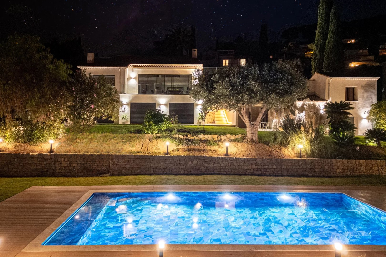 Внешние зоны обеспечивают комфорт проживания с новым бассейном, оснащенным системой электролиза и безопасными жалюзи, в окружении освещенного сада. На участок можно попасть напрямую с проезжей части через два моторизированных ворот или две пешеходные калитки, предлагая парковочные места для десяти автомобилей. Технически дом предлагает замечательные характеристики — новая изоляция обеспечивает энергетический рейтинг B, алюминиевые окна с двойным остеклением, независимая регулируемая система кондиционирования с возможностью обогрева, камин с системой теплообмена, а также недавно обновленные электрическая и гидравлическая сети гарантируют комфорт в течение всего года. Умный дом позволяет дистанционно управлять всеми системами, включая жалюзи, ворота, освещение и температуру.