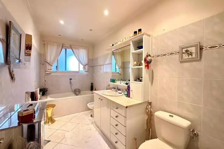Эта очень светлая квартира включает: вход, гостиную площадью 45 м², отдельную кухню, две спальни с ванными комнатами и туалетом, душевую комнату, террасу и лоджию.