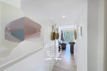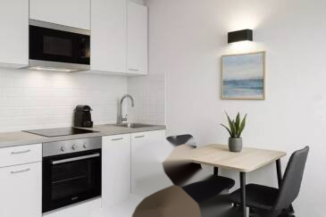 Светлая гостиная с открытой кухней выходит на балкон, что идеально подходит для наслаждения видом на улицу.