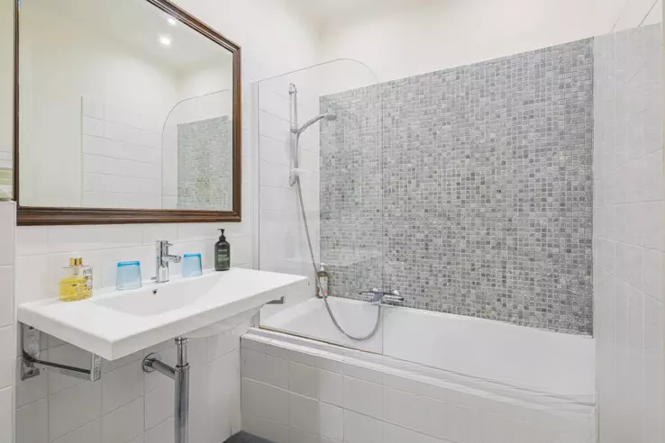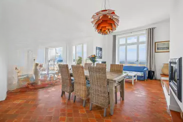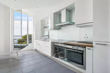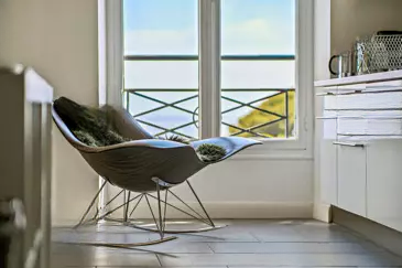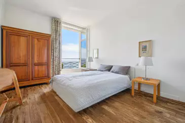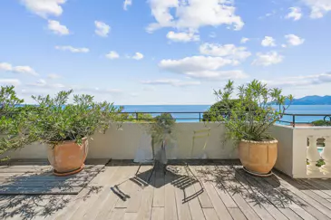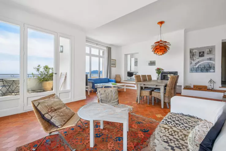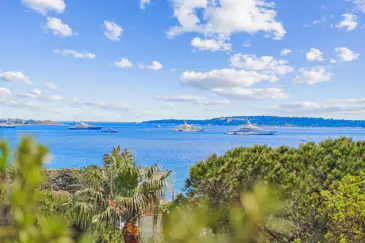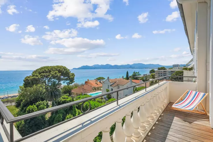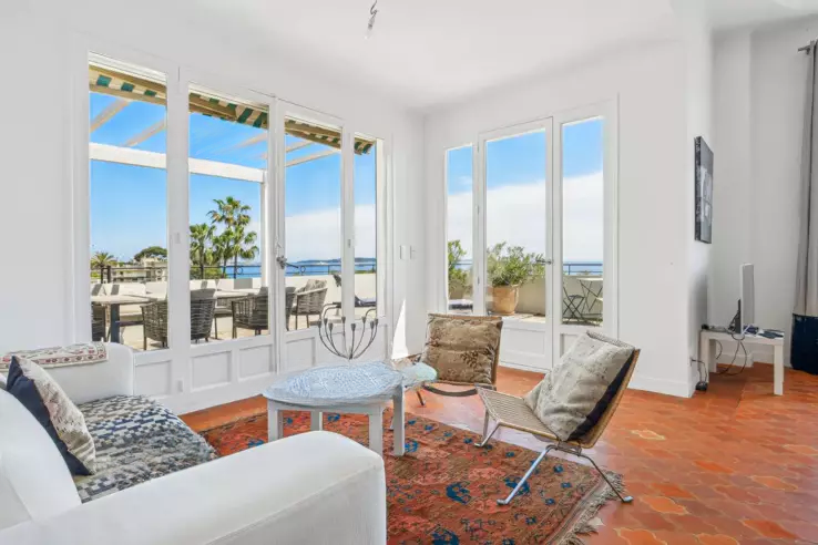 Апартаменты включают в себя просторную гостиную с камином, которая выходит на большую террасу с панорамным видом на море, бухту Канн и холмы Эстрель. Современная полностью оборудованная кухня, большая главная спальня с ванной комнатой, а также три другие спальни, которые делят одну ванную комнату. Имеются окна с двойным остеклением и маркизы на террасе.