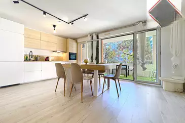 Многообещающим является просторная гостиная площадью более 30 кв.м с кондиционером. Она комфортна и укрыта от посторонних глаз. Здесь великолепно интегрирована полностью оборудованная открытая кухня. Кроме того, на западной стороне расположена терраса размером 10 кв.м. для отдыха на свежем воздухе.