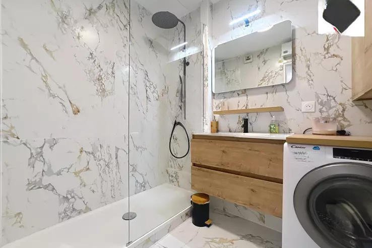 В спальне расположены шкафы, рядом просторная душевая с итальянской концепцией, также есть шкафы, полотенцесушитель и место для стиральной машины. В отдельной комнате находится туалет. Также доступна приватная парковка прямо перед зданием.