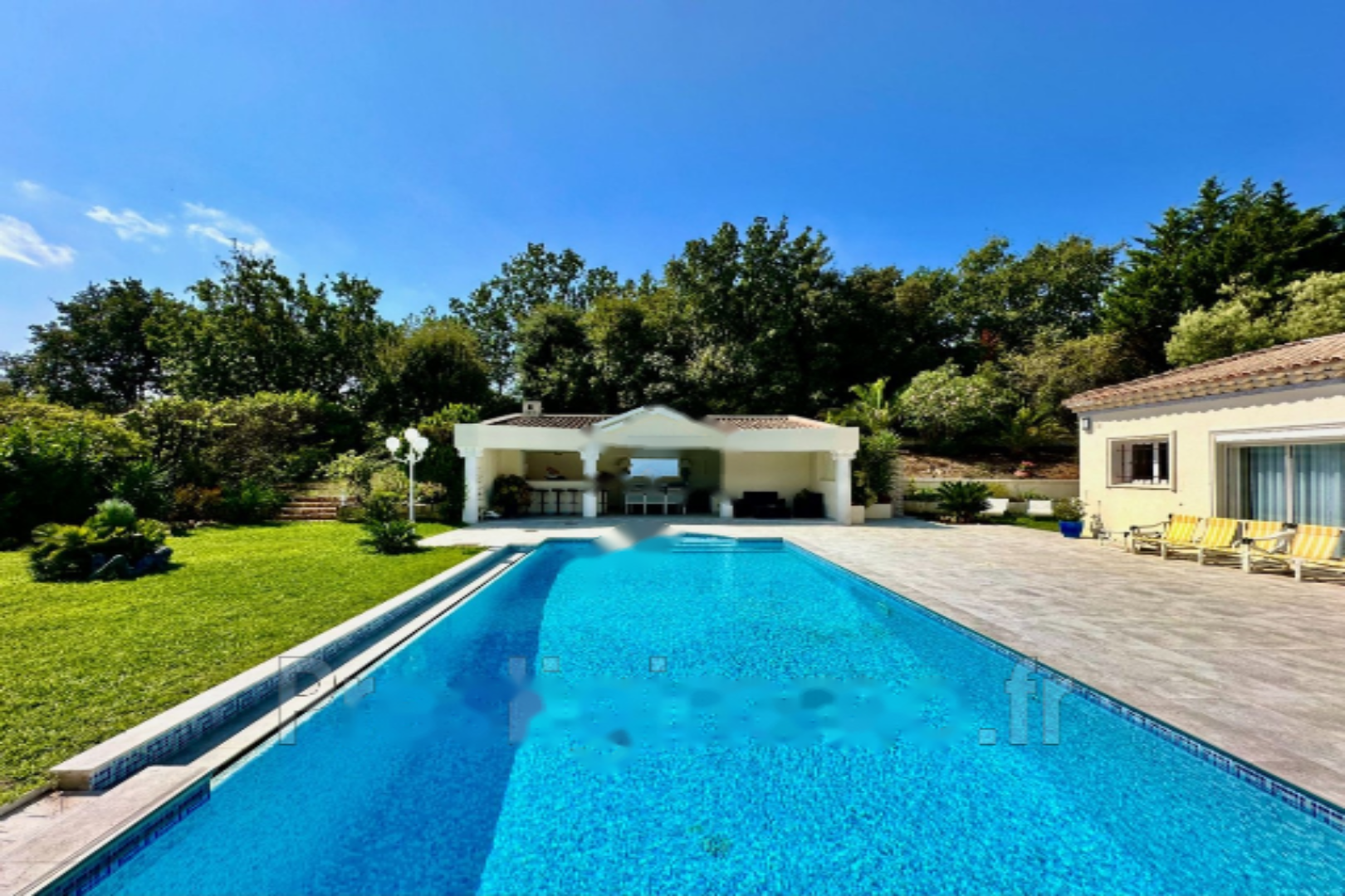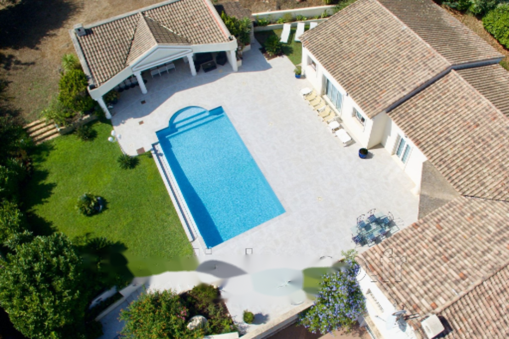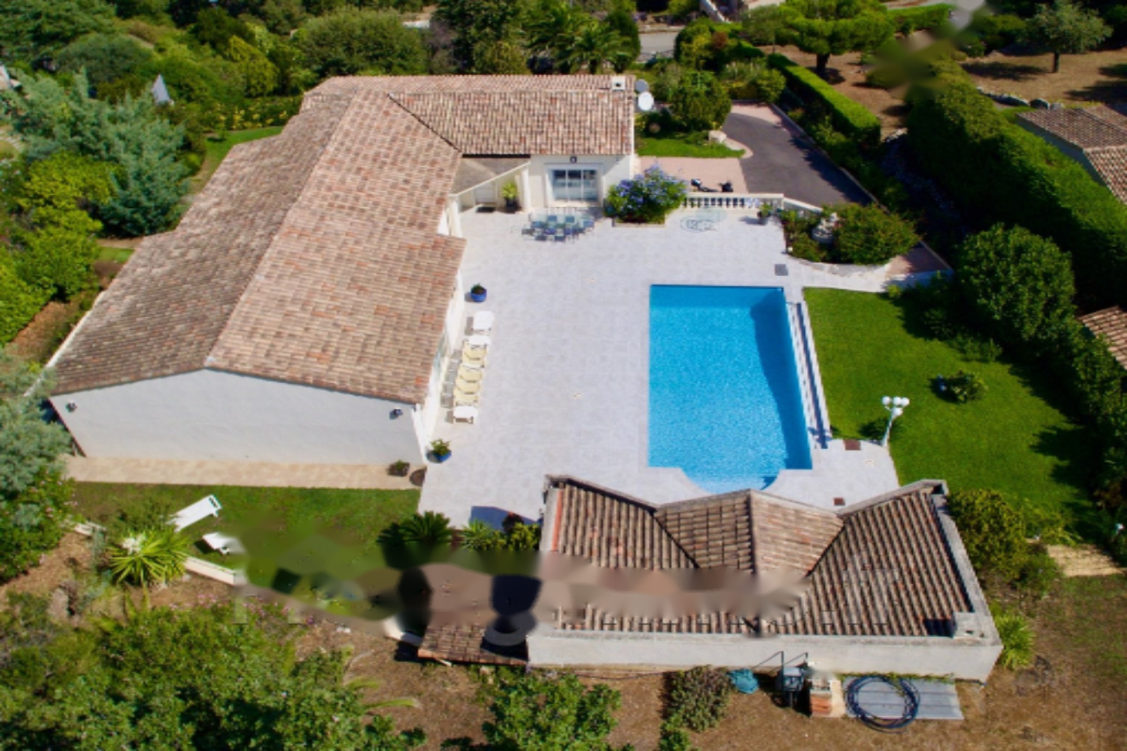 Эта вилла 80-х годов была полностью отремонтирована в 2021 году с использованием качественных материалов и располагает просторной светлой гостиной площадью 70 м² с кухней американского типа, 4 спальнями с ванными комнатами, все на одном уровне, с душевыми, ванными и туалетами. Также имеется отдельная трехкомнатная квартира площадью около 90 м² с выходом в сад, одной спальней, кабинетом, двумя душевыми комнатами, ванной и туалетом, а также крытая терраса. Гараж на одно место.
