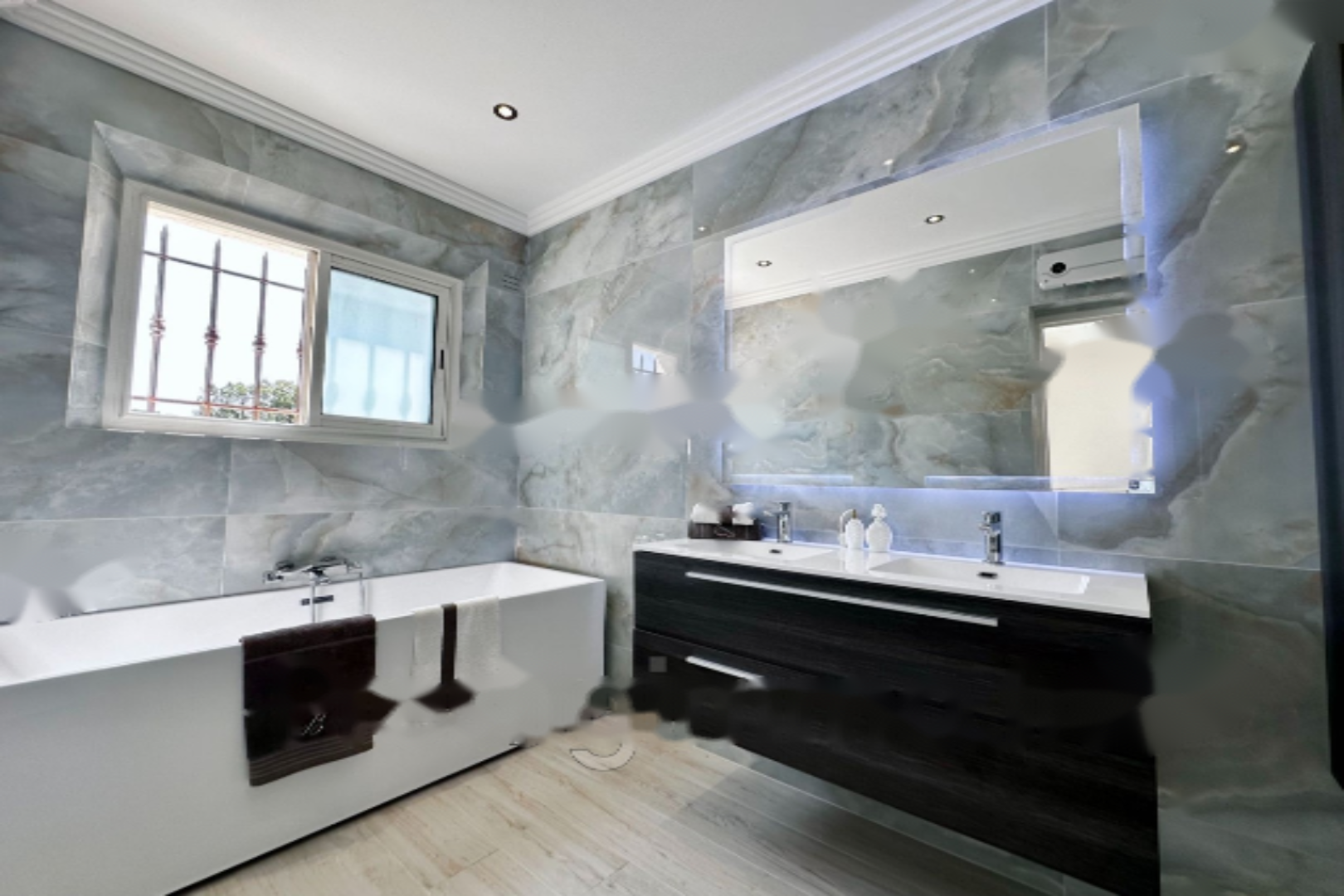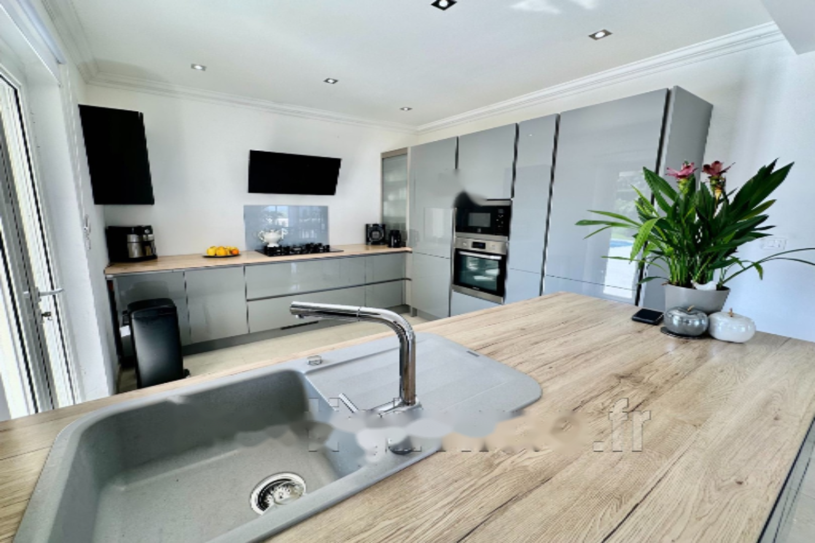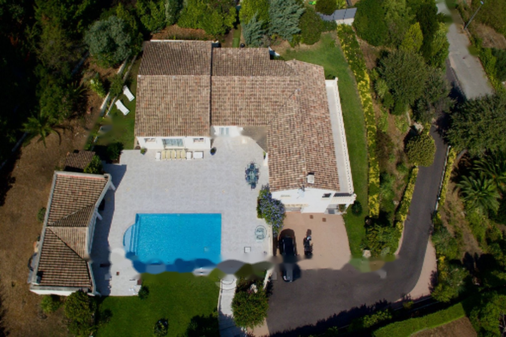 Эта вилла 80-х годов была полностью отремонтирована в 2021 году с использованием качественных материалов и располагает просторной светлой гостиной площадью 70 м² с кухней американского типа, 4 спальнями с ванными комнатами, все на одном уровне, с душевыми, ванными и туалетами. Также имеется отдельная трехкомнатная квартира площадью около 90 м² с выходом в сад, одной спальней, кабинетом, двумя душевыми комнатами, ванной и туалетом, а также крытая терраса. Гараж на одно место.