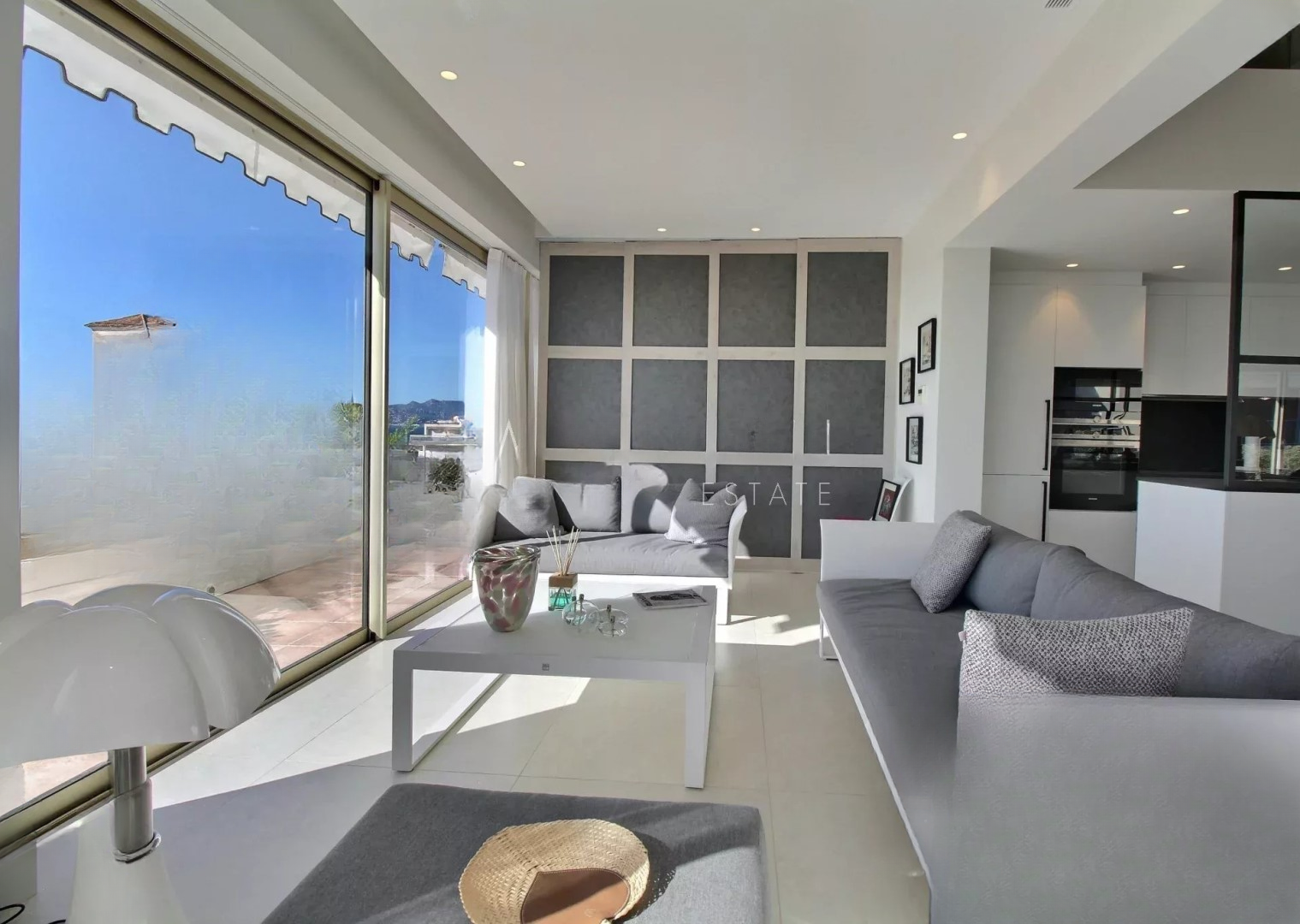 Он состоит из просторной гостиной со столовой под соборным потолком, открывающейся на террасу 35 м², с ориентацией на юг и великолепным видом на море.