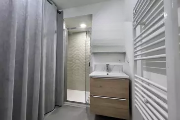 В хорошо обслуживаемой резиденции. Двухкомнатная квартира площадью 24 м², идеально отремонтирована, продается меблированной и оборудованной. Она состоит из: входа, подвесного отдельного туалета, гостиной с открытой и оборудованной кухней, спальни с ванной комнатой и полотенцесушителем.