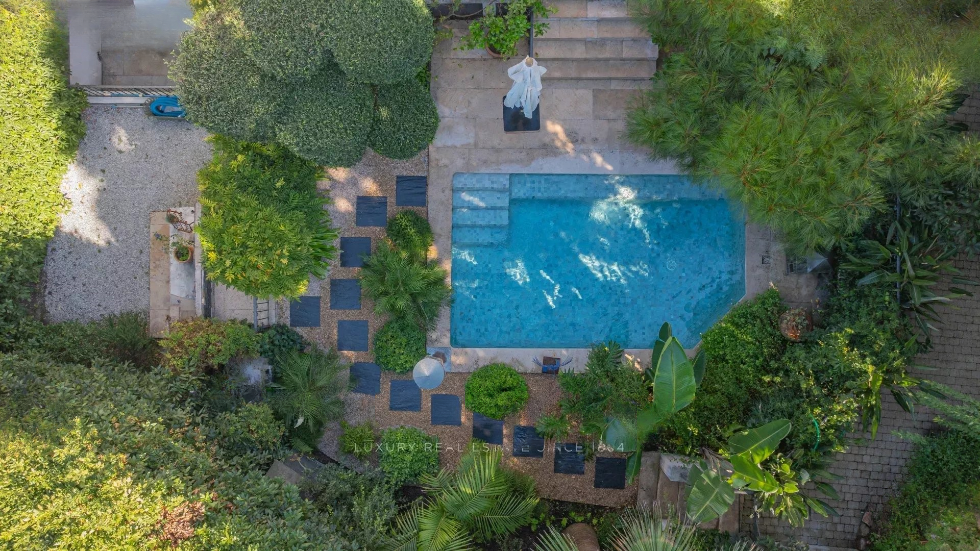 Прекрасный сад с южной ориентацией площадью около 500 м² с бассейном с соленой водой. Закрытый гараж. Парковочное место перед воротами.