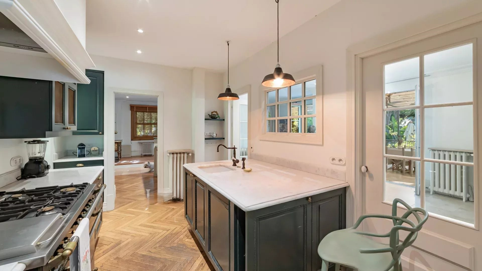 Она состоит из следущих помещений: холл с высоким потолком, гостиная, столовая с прямым выходом на большую террасу и бассейн с соленой водой, полностью обновленная кухня с использованием очень качественных материалов.