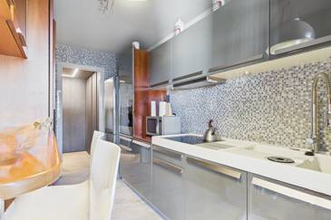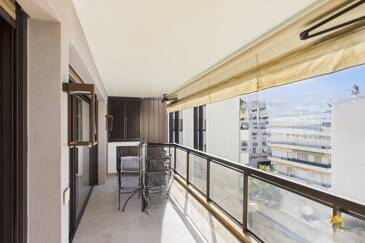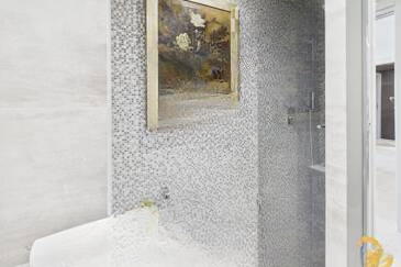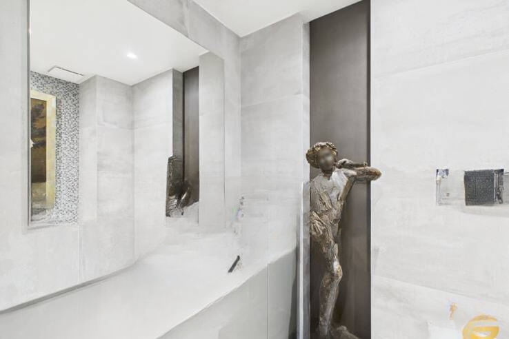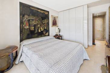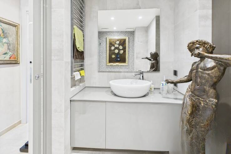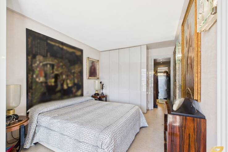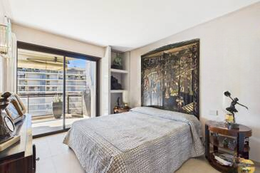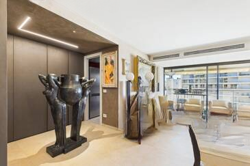 Сразу при входе вас встречает уютный холл с организованным на заказ гардеробом. Полностью оборудованная кухня открыта на просторную, светлую гостиную, создавая атмосферу комфорта и уюта. Обе эти комнаты имеют прямой выход на великолепную террасу площадью 14 м² с видом на море, что идеально подходит для наслаждения каннским климатом.