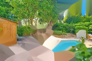 На первом этаже расположены: вход, просторная гостиная/столовая, выходящая на террасу с видом на сад и бассейн, открытая кухня, одна спальня, ванная комната с туалетом.