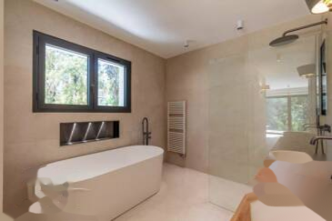 - на втором этаже: главная спальня с гардеробной, ванной комнатой/душем и независимым туалетом, выходящая на террасу, две другие спальни, одна из которых также выходит на террасу с душевой, и независимый туалет.