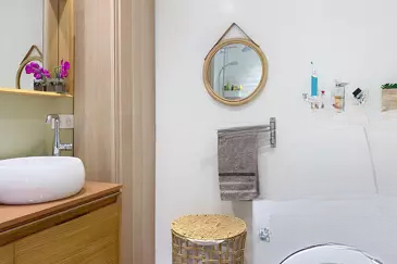 Апартамент также включает ванную комнату, прачечную область и отдельный туалет. ☀️ Жильё оборудовано обширными местами для хранения, двойными стеклопакетами и реверсивным кондиционером. Подвал и сушильная комната включены в стоимость. Парковочное место доступно в аренду за 20 евро в месяц.