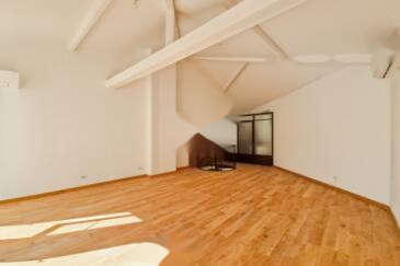 С террасы открывается вход во второй двухуровневый апартамент: светлый и просторный, он включает большую жилую комнату, гостевой туалет и впечатляющую спальню более 45 м² на мезонине, который можно использовать по-разному (спальня, офис, мастерская или игровая комната) или преобразовать в две комфортные спальни.