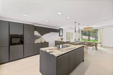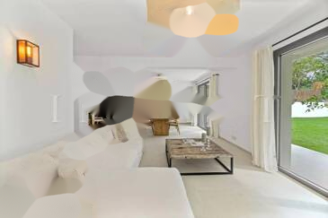 На первом этаже расположены прихожая, туалет, красивая светлая гостиная площадью 90 кв. м с оборудованной открытой кухней, гостиной и столовой, которые широко открываются в сад.