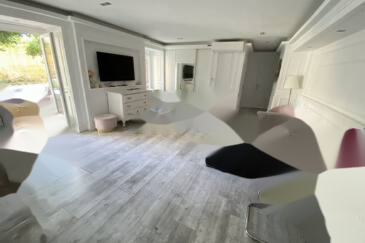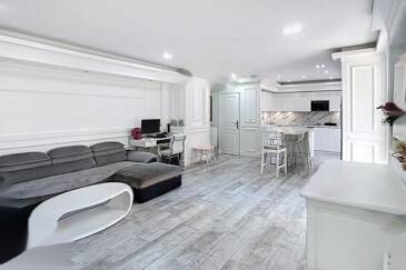В квартире предусмотрены вход, гостиная с открытой кухней площадью 40 м², три спальни с шкафами, кабинет, прачечная, две душевые комнаты и два раздельных туалета.