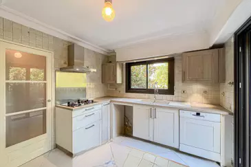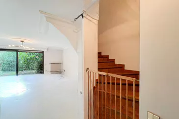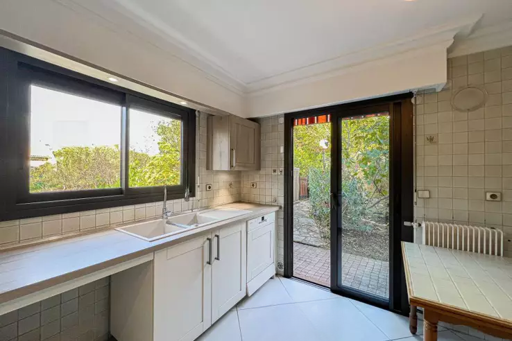 На первом этаже: просторная и светлая гостиная с выходом на террасу и в частный сад на южную сторону, просторная отдельная кухня с прямым доступом в сад, а также гостевой туалет.
