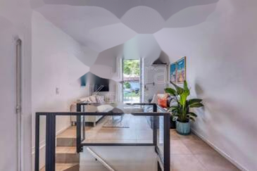Квартира имеет домашнюю атмосферу. Вход осуществляется через традиционную входную дверь, затем лестница ведет к основному входу, где вас ждет светлая гостиная в открытом пространстве. Полностью оборудованная американская кухня элегантно интегрирована в комнату с центральным островом и табуретами, идеально подходящими для завтраков или дружеских посиделок. Гостиная открывается на зеленый сад, освещаемый солнцем утром и днем, в абсолютно спокойной обстановке.