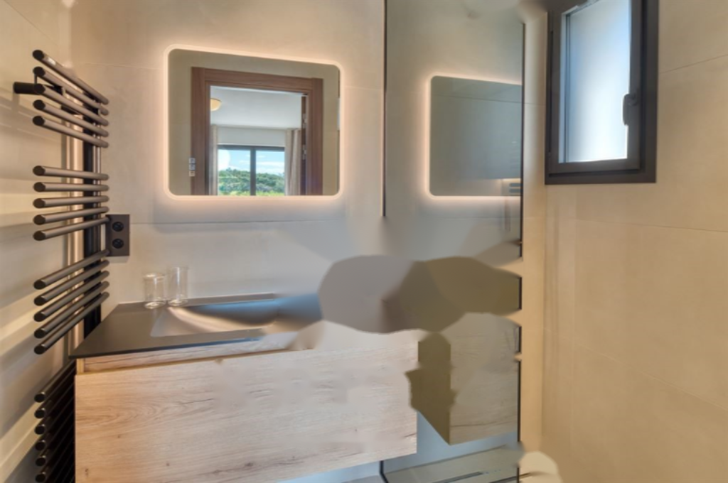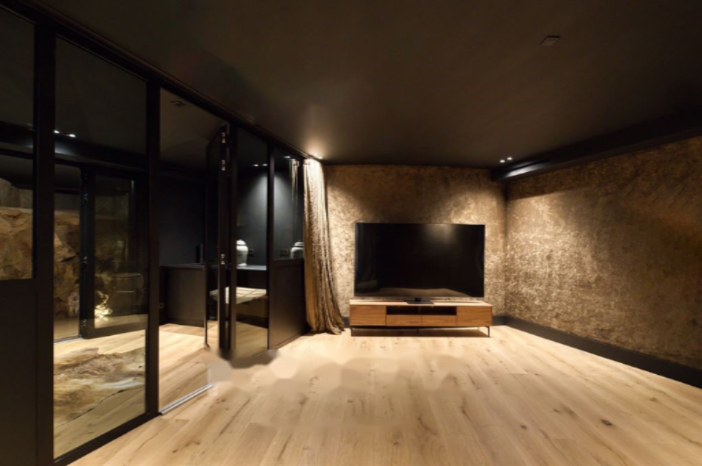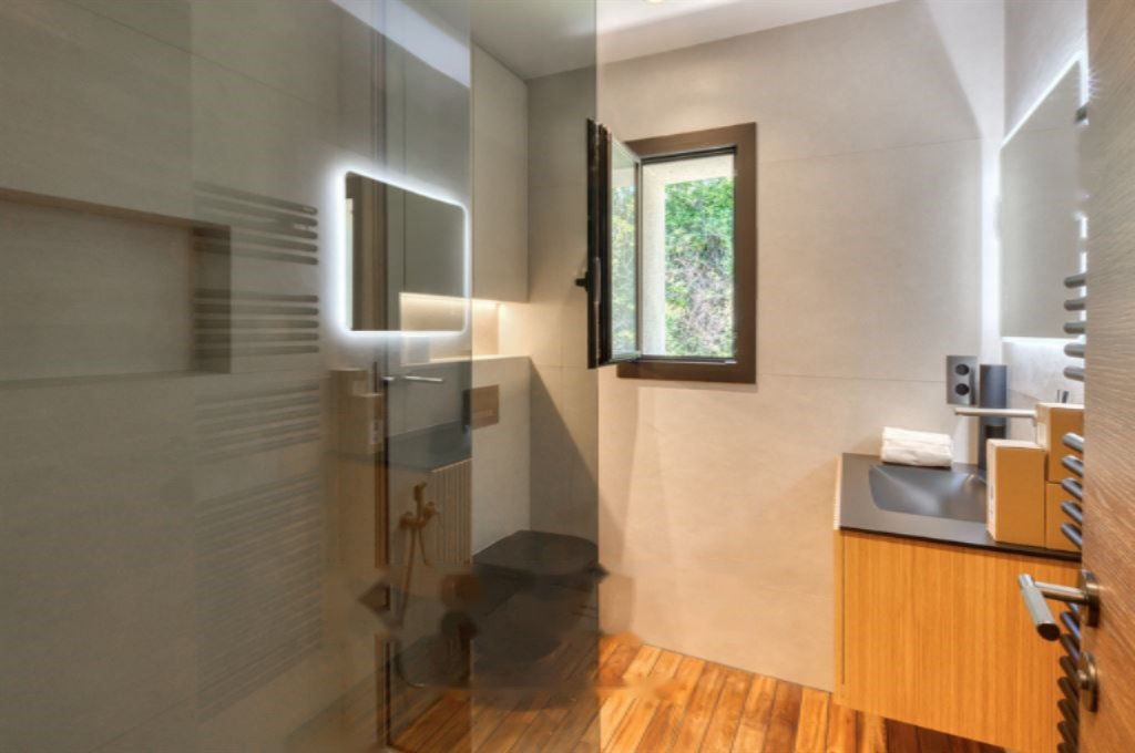 На уровне первого этажа: 2 спальни люкс, фитнес-зал, кинотеатр, винный погреб и дегустационный зал, хаммам, техническое помещение, прачечная, помещение для персонала и гараж на 3 машины.