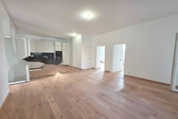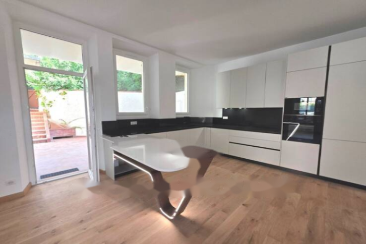 Первый апартамент с одной стороны, площадью около 80 м², включает: прихожую, гостиную, столовую, полностью оборудованную дизайнерскую кухню SNAIDERO Pinifarina, с выходом на террасу и сад сзади, один туалет и две спальни, одна из которых с ванной и большой душевой.