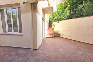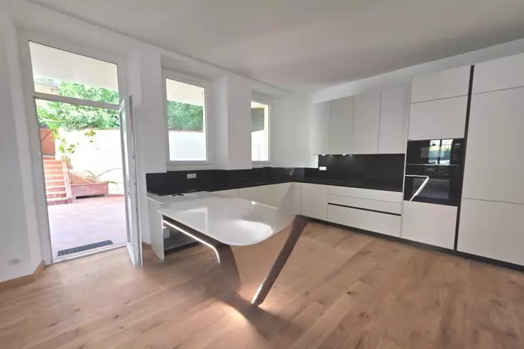 Первый апартамент площадью около 80 м² включает: прихожую, гостиную, столовую с кухней SNAIDERO Design Pinifarina, полностью оборудованной, выходящей на заднюю террасу-сад, 1 туалет, 2 спальни, одна из которых люксовая с ванной и большой душевой.