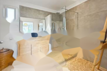 Построенный на плоском участке площадью 1 437 кв. м, основной дом предлагает примерно 200 кв. м жилой площади. Он состоит из большой светлой гостиной с салоном, столовой и полуоткрытой кухни, дополненной подсобкой. На этом уровне также находятся отдельный кабинет и прачечная.