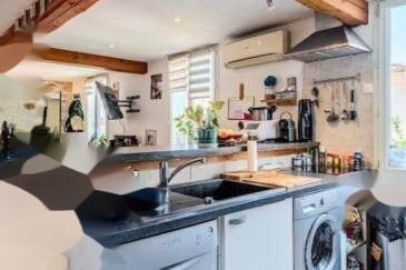 Продается двухуровневая квартира, расположенная в тихом районе, на первом этаже небольшого дома в совместной собственности, рядом с магазинами, школами и автобусными остановками, в 15 минутах ходьбы от Дворца фестивалей и пляжей. Состоит из гостиной-столовой площадью около 35 м² с прихожей и гостевым туалетом с умывальником, оборудованной открытой кухни с видом на сад.