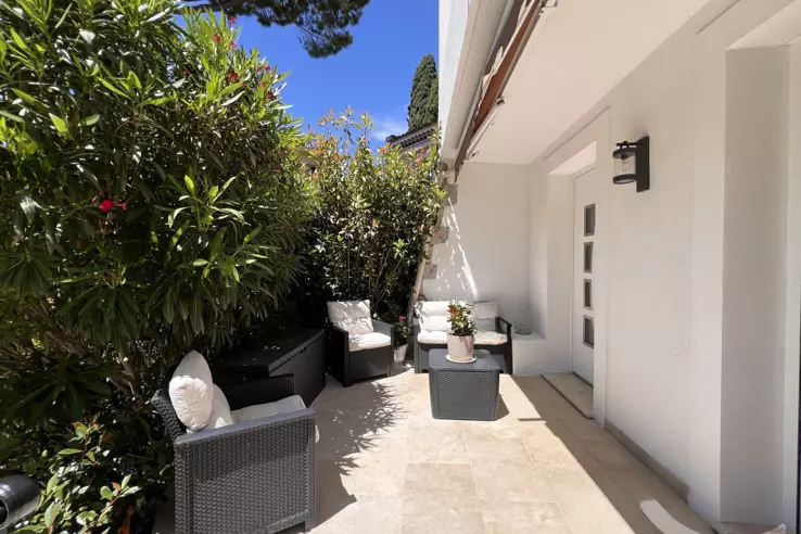 Канны - Монфлёри: В тишине, в 1 км пешком от улицы Антиб, в охраняемой резиденции, квартира вилла с жилой площадью 124 м² (114 м² по закону Каррез), полностью отремонтированная, с выходом на террасу и сад площадью около 50 м².