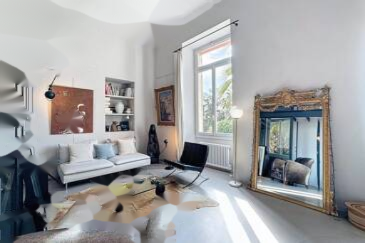 Полностью обновленная с использованием качественных материалов, квартира тщательно спроектирована и предлагает просторные помещения. Она включает в себя прихожую, ведущую в большую комнату с гостиной зоной, полностью оборудованную открытую кухню и большой обеденный стол. Высота потолков составляет впечатляющие 4,20 м, а большие окна выходят на сад и открывают великолепный вид на море.