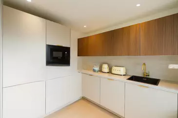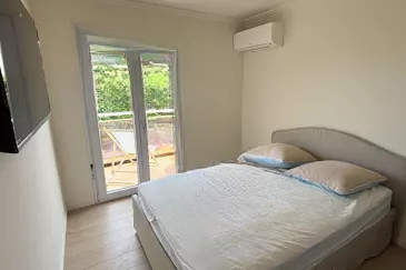 Она включает в себя прихожую с шкафами, гостиную с полностью оборудованной открытой кухней, душевую комнату, туалет, первую спальню, все с выходом на прекрасную террасу площадью 9 м², ориентированную на юго-восток с частичным видом на море, и вторую спальню с шкафами. Квартира полностью кондиционирована и продается с подвалом.