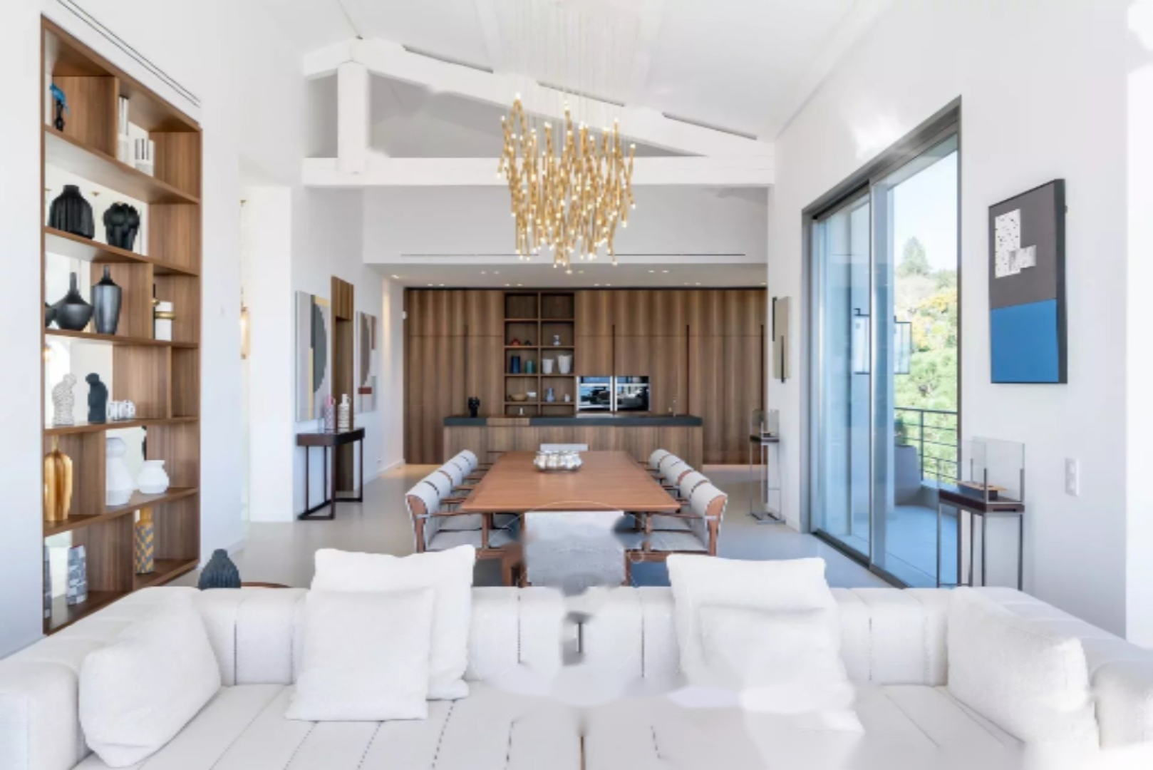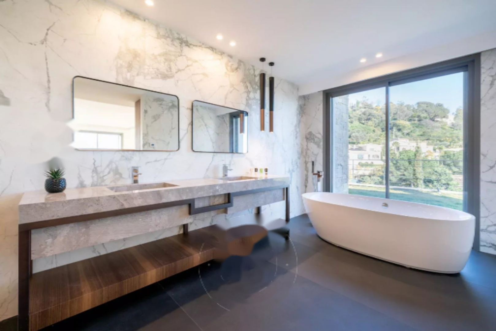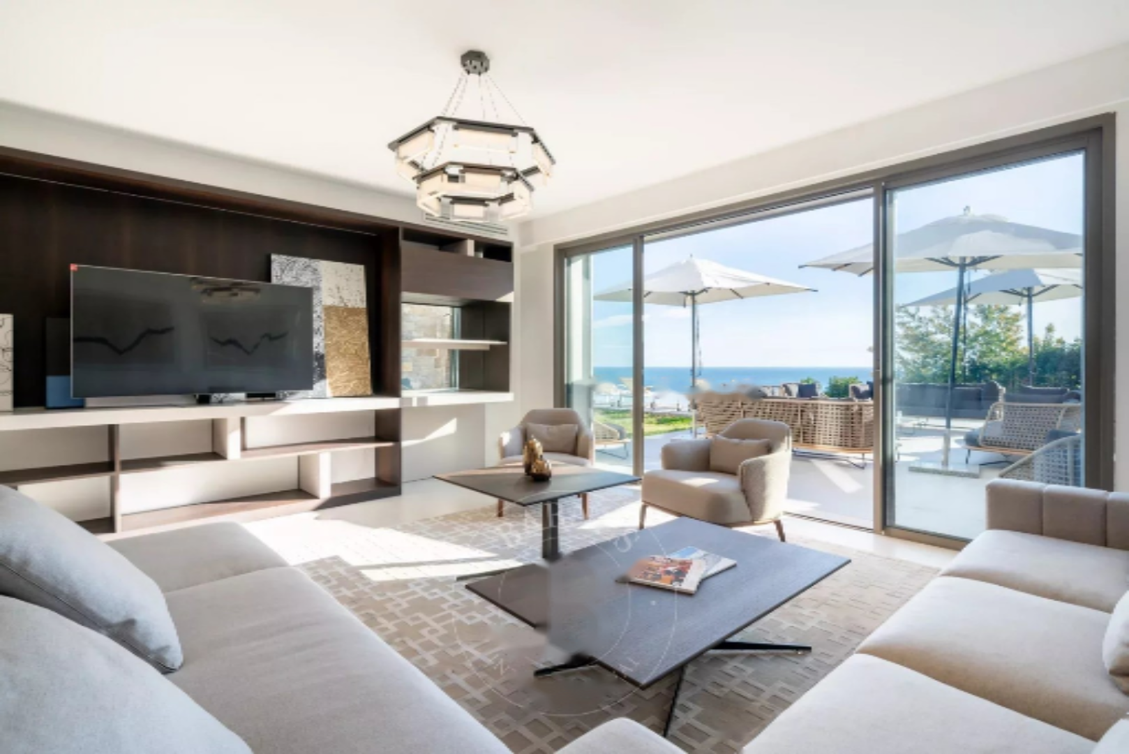 На площади около 450 м² располагается просторная гостиная/столовая с полностью оборудованной открытой кухней. Красивая спальня с ванной комнатой, расположенная на одном уровне. На нижнем этаже: 4 спальни с ванными комнатами, включая большую главную спальню с ванной, гардеробной, гостиной и кухней с видом на море. Участок около 2500 м² с бесконечным бассейном. Гаражи на 3 машины и множество парковочных мест.