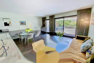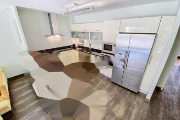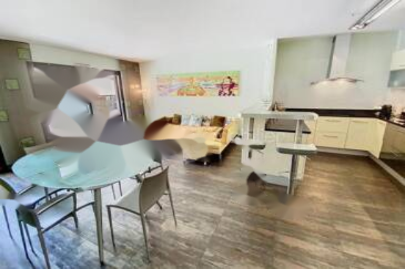 Войдя, вы попадете в прихожую с коридором, который ведет в гостиную с полностью оборудованной и меблированной американской кухней, общей площадью 40 м², наполненной светом.